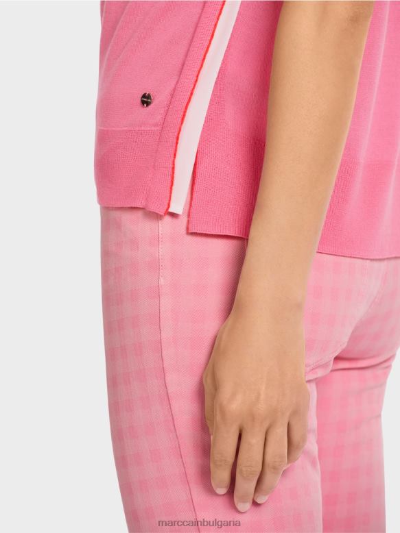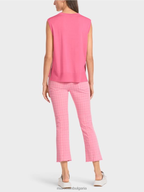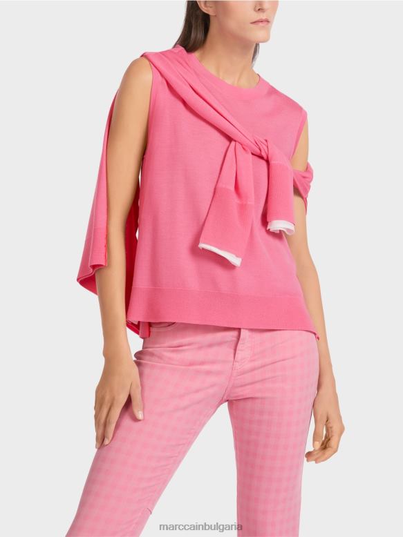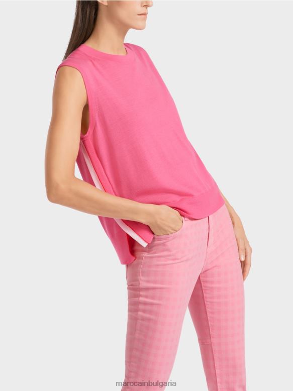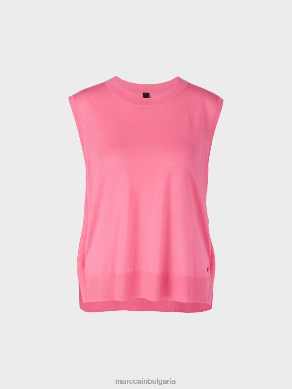 плетена горна част без ръкави. супер фината плетена тъкан получава необходимата стабилност от отличителната полиамидна обшивка. страничните цепки са умело прикрити чрез напластяване в страничния шев.