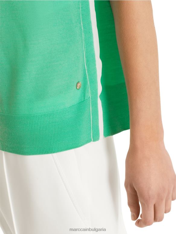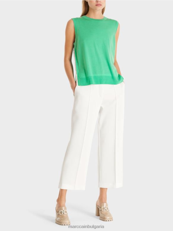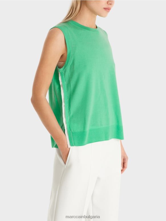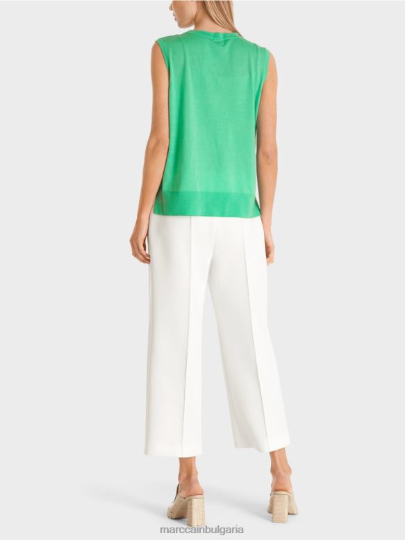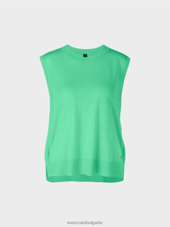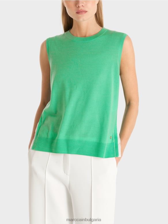 плетена горна част без ръкави. супер фината плетена тъкан получава необходимата стабилност от отличителната полиамидна обшивка. страничните цепки са умело прикрити чрез напластяване в страничния шев.
