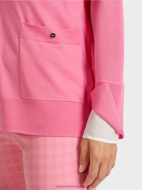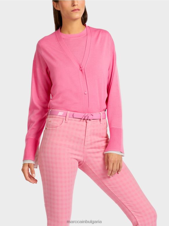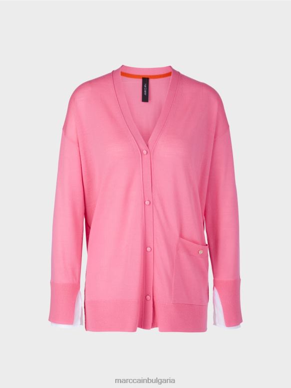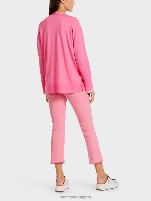 тази елегантна жилетка е небрежно свободна и има ниско разположени ръкави. деликатната плетка е подчертана със здрави кантове. подгъвът на ръкава е подплатен с контрастен материал, за да създаде впечатление за ръкав на блуза, който наднича и добавя шикозен детайл.