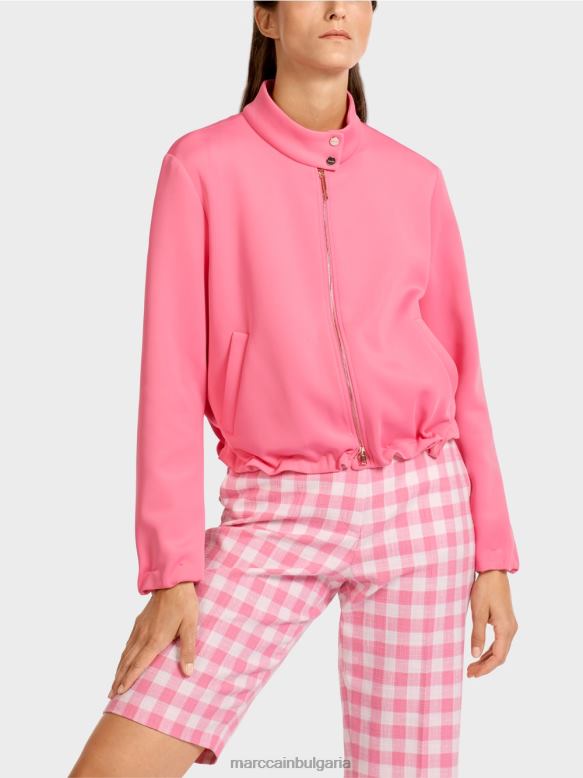 спортно яке от трико в спокоен силует. якето е със здрав двупосочен метален цип. стоящата яка е декорирана с две копчета. два нарязани джоба подчертават комфорта по време на носене. ръчно зашитият вид на подгъва добавя декоративен детайл.